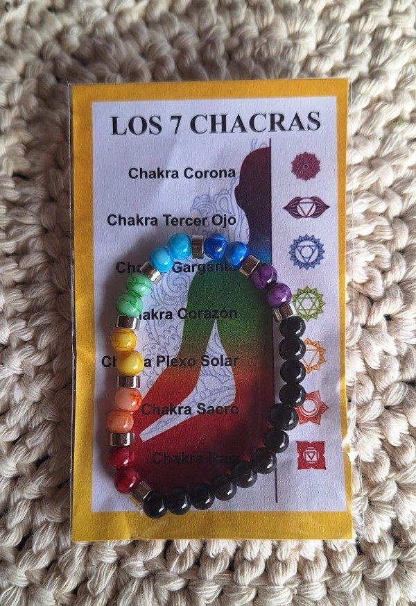 Pulsera de los 7 chakras, se cree que al usar esta pulsera, se puede aumentar la percepción de los propios pensamientos, emociones y comportamientos, lo que puede conducir a un mayor autoconocimiento y crecimiento personal.